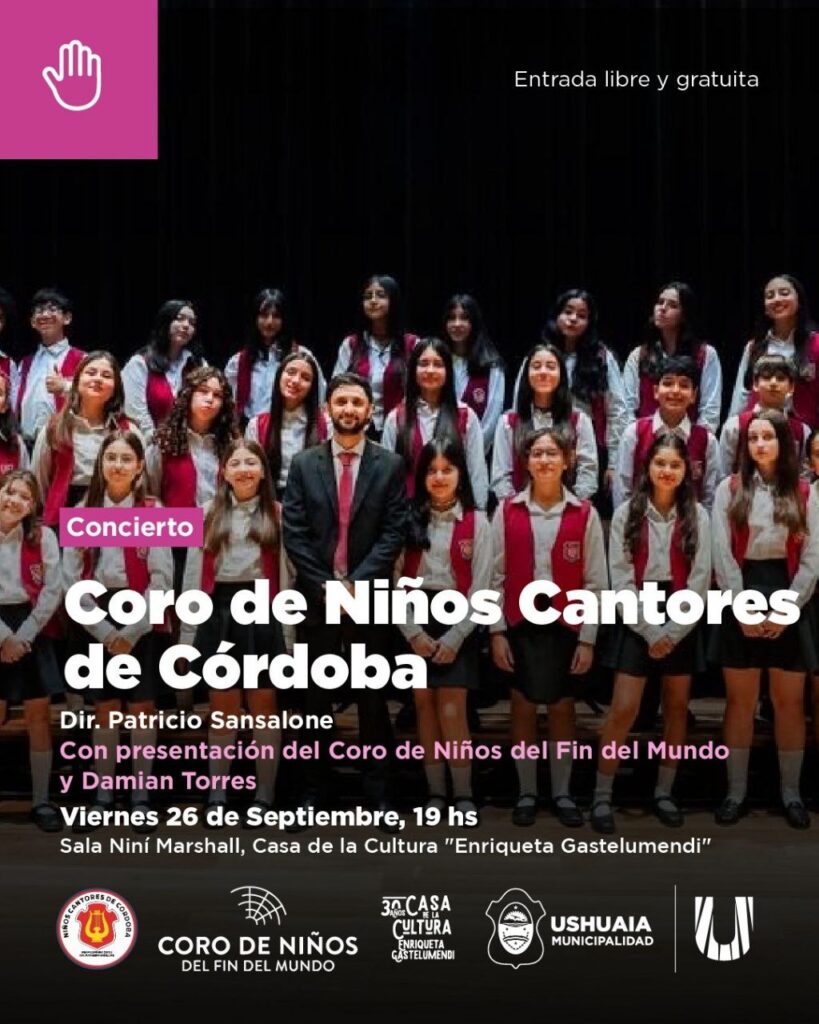 La Municipalidad de Ushuaia, a través de la Secretaría de Cultura y Educación, acompañará este viernes 26 de septiembre a las 19:00 horas en la Sala Niní Marshall de la Casa de la Cultura Enriqueta Gastelumendi el Concierto “Coro de Niños Cantores de Córdoba”, el mismo será con entrada libre y gratuita.