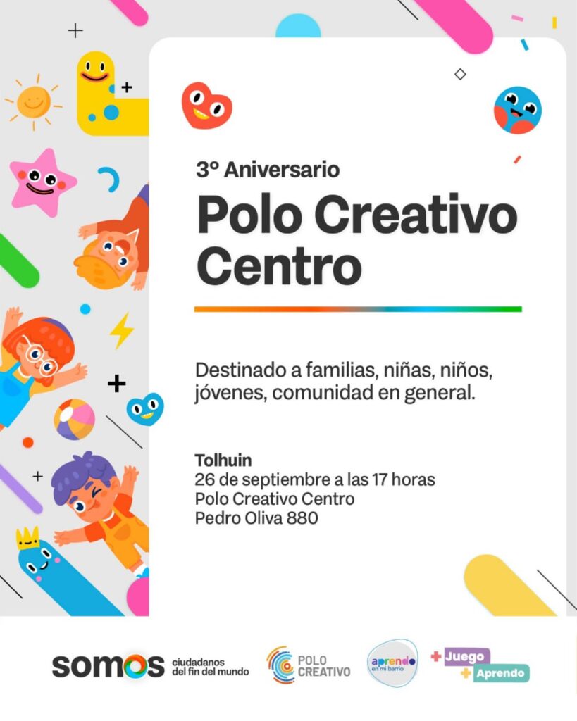 La Secretaría de Gestión, Polos y Fábricas de Talento, invita a la comunidad a festejar el tercer aniversario del Polo Creativo Centro que tendrá lugar el 26 de septiembre a las 17 h. en Pedro Oliva 880 de la comunidad de Tolhuin.