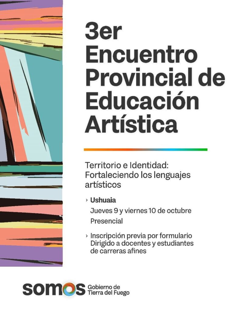 El Gobierno de Tierra del Fuego, AeIAS, llevará adelante el 3er Encuentro Provincial de Educación Artística denominado “Territorio e Identidad: Fortaleciendo los Lenguajes Artísticos en Tierra del Fuego AeIAS”. Será los días 9 y 10 de octubre en el Gimnasio del Centro Polivalente de Arte (Av. Leandro Alem N°15) de la ciudad de Ushuaia de 8:00 a 17:00 horas.