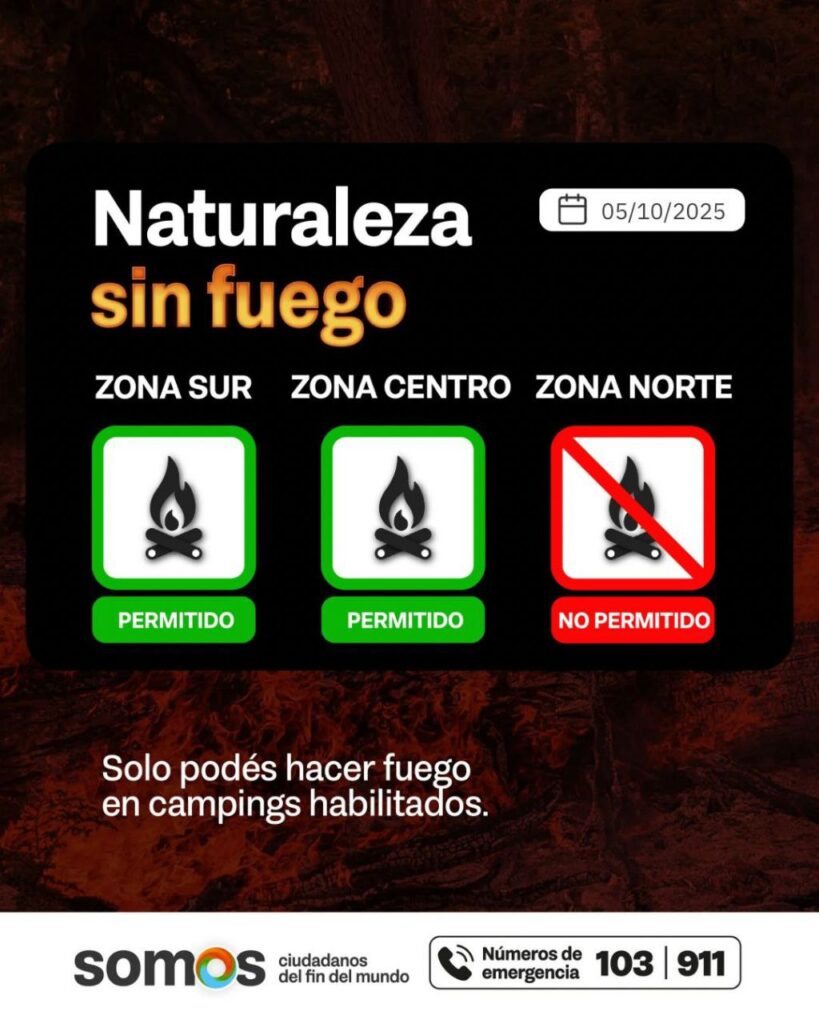 El día de hoy, en las ciudades de Tolhuin y Ushuaia, está permitido hacer fuego, únicamente en campings habilitados, mientras que en Río Grande está prohibido hacer fuego, aún en sitios habilitados.