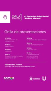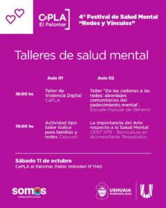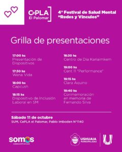 La Municipalidad de Ushuaia invita a participar del 4° Festival de Salud Mental “Redes y Vínculos”, que se llevará adelante el sábado 11 de octubre en el CePLA-El Palomar (Pablo Imboden 1140).