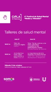 En el marco de la programación se ofrecerán talleres sobre violencia digital, abordajes comunitarios del padecimiento mental, actividades lúdicas para familias y redes, y propuestas vinculadas al arte y la salud.