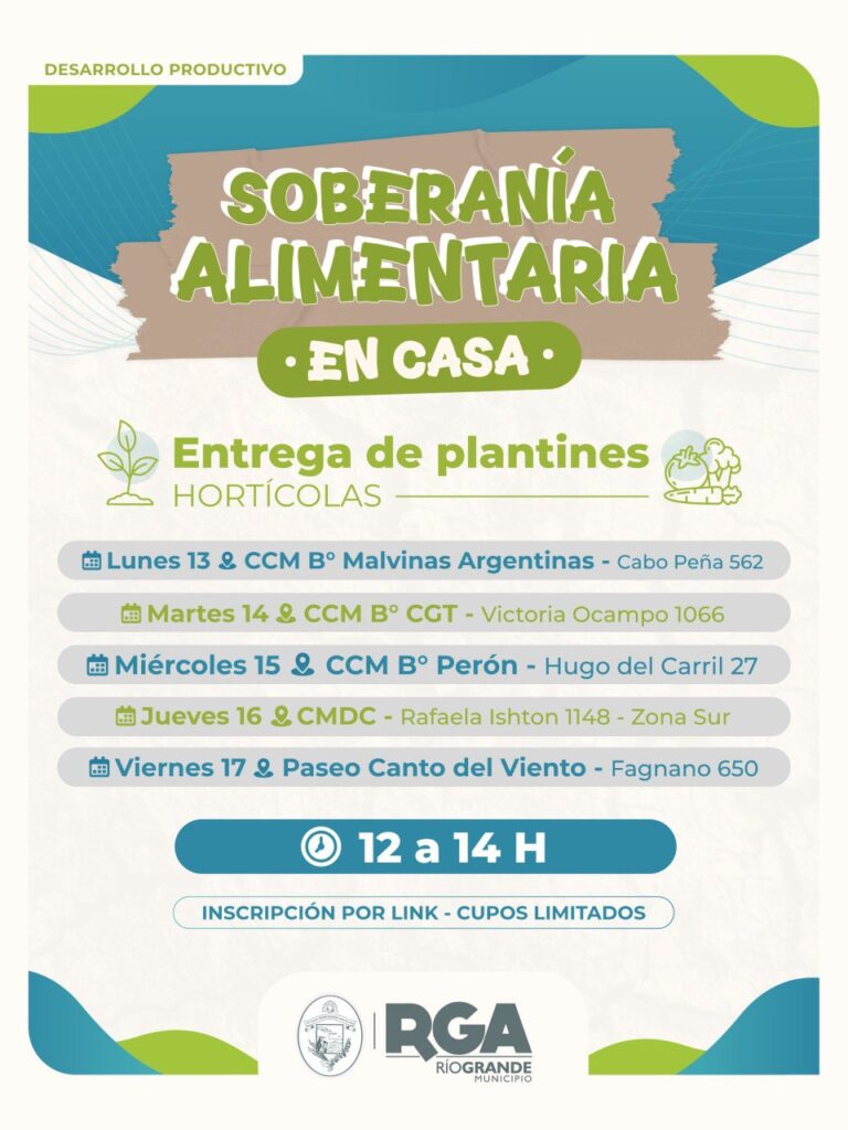 Con el inicio de la temporada hortícola, el Municipio de Río Grande entregará plantines de hortalizas a vecinos y vecinas que se inscriban a través del siguiente link https://bit.ly/47izR8t. Para esta temporada, se proyecta la distribución de más de 2.000.000 plantines a productores y comunidad en general con el fin de promover y continuar impulsando el desarrollo de la soberanía alimentaria en nuestra ciudad.