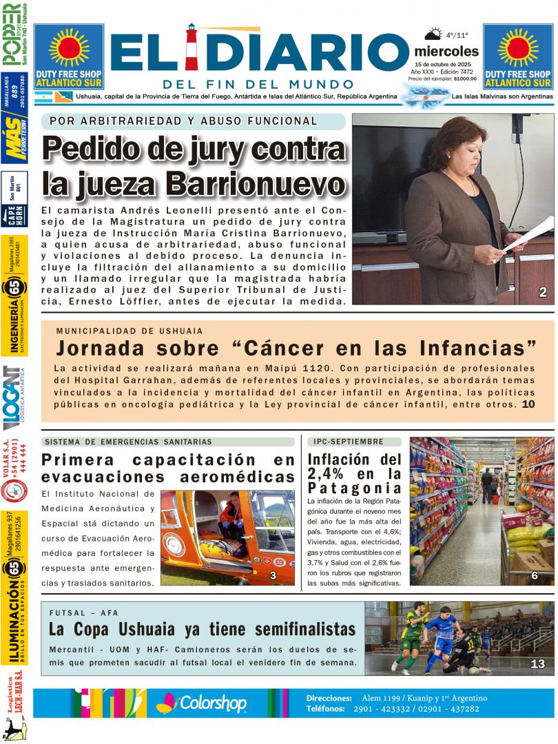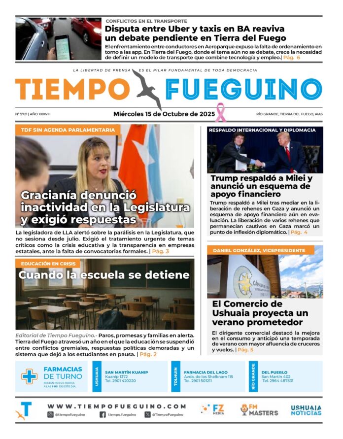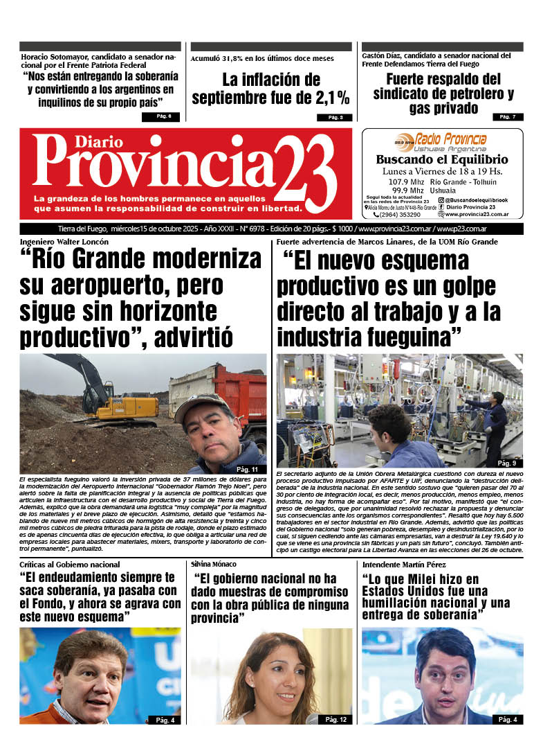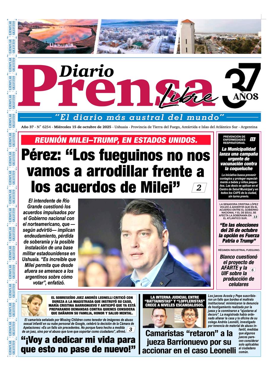 Noticias DIARIOS FUEGUINOS DEL 15/10/2025. octubre 15, 2025 Continue Reading Previous USHUAIA : LA MUNICIPALIDAD LANZA UNA CAMPAÑA URGENTE DE VACUNACIÓN CONTRA LA COQUELUCHENext DIARIOS NACIONALES DEL 15/10/2025.