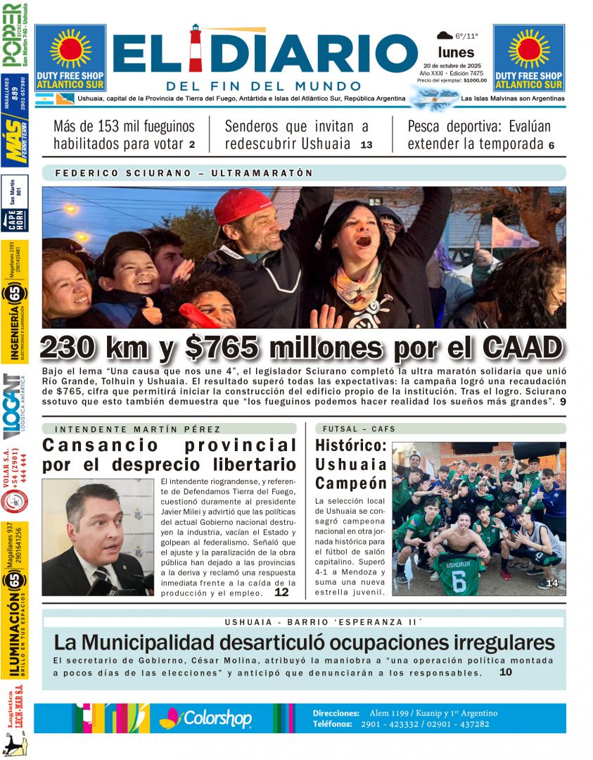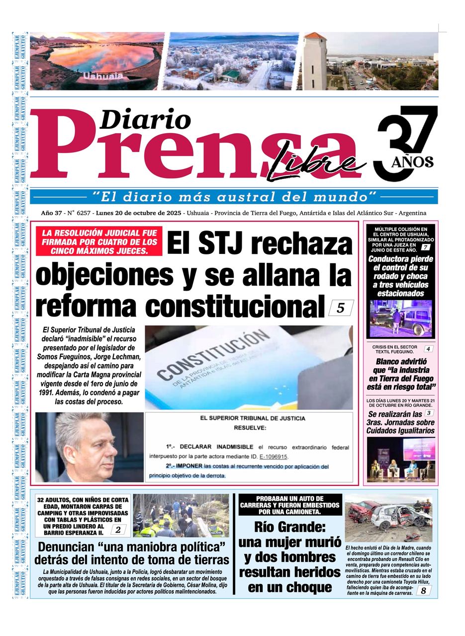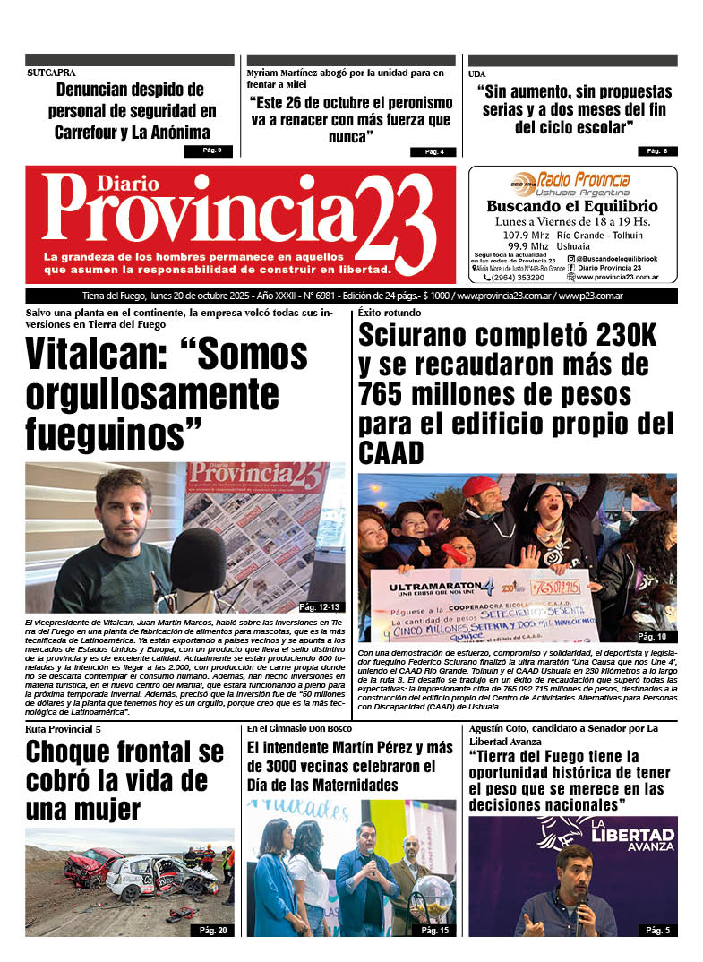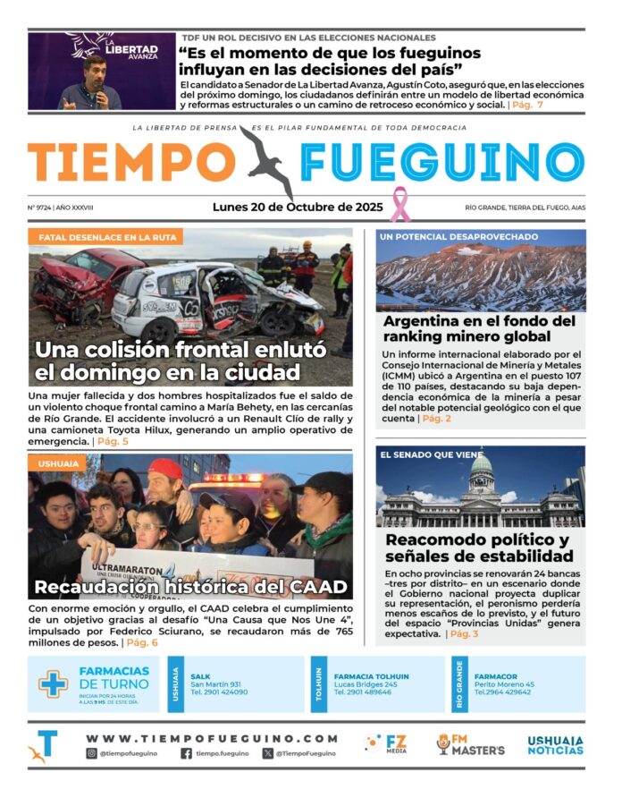 Noticias DIARIOS FUEGUINOS DEL 20/10/2025. octubre 20, 2025 Continue Reading Previous EL GOBERNADOR MELELLA SE REUNIÓ CON DEPORTISTAS DE TOLHUIN QUE COMPITIERON EN EL WORLD CHAMPIONSHIP DE TAEKWONDONext DIARIOS NACIONALES DEL 20/10/2025.