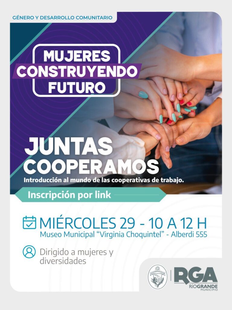 Desde la Secretaría de Género y Desarrollo Comunitario del Municipio de Río Grande se llevará adelante una nueva capacitación en el marco del programa Mujeres Construyendo Futuro, bajo el título “Juntas Cooperamos: introducción al mundo de las cooperativas de trabajo”.