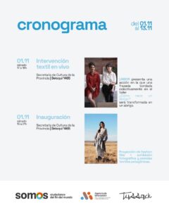 • Sábado 02/11 – 19 h.: Inauguración (Gob. Deloqui 1465). Proyección de fashion film + exhibición fotográfica y prendas textiles patagónicas.