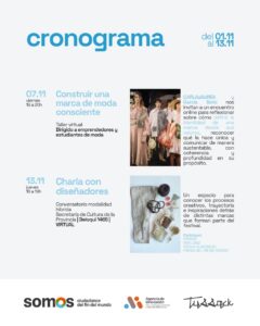 • Viernes 07/11 – 19 h.: “Construir una marca de moda consciente” (Virtual). La diseñadora Juliana García Bello invita a un encuentro online para reflexionar sobre la identidad de marca, el valor y la comunicación sustentable.