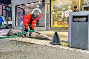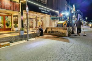 Durante la jornada de ayer, la Secretaría de Ambiente y Desarrollo Sustentable y la Secretaría de Planificación e Inversión Pública (Servicios Públicos) llevaron adelante una intervención en la zona céntrica, realizando limpieza de alcantarillas pluviales, lavado de veredas y la preparación de superficies para su posterior pintura en la jornada de hoy.