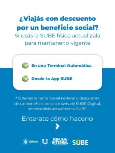 La Municipalidad de Ushuaia recuerda a las y los usuarias/os del transporte público que utilicen la tarjeta SUBE física con beneficios locales, que es fundamental realizar la actualización para asegurar que los descuentos se apliquen correctamente al momento de viajar.