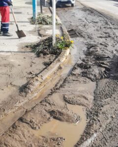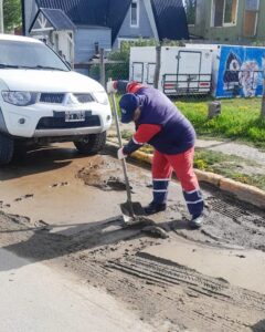 Las tareas incluyen la remoción de barros superficiales, la limpieza de alcantarillado y trabajos en pluviales, en coordinación con la empresa Agrotécnica Fueguina. Además, se procedió al despeje de piedras y sedimentos arrastrados por el temporal que provocó la creciente extraordinaria del arroyo que atraviesa la ciudad.
