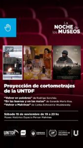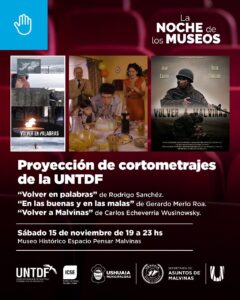 Durante la jornada, el público podrá disfrutar de visitas guiadas y de la proyección de tres cortometrajes con temática vinculada a las Islas Malvinas, realizados por estudiantes de la Universidad Nacional de Tierra del Fuego. “Volver en palabras” de Rodrigo Sánchez, “En las buenas y en las malas” de Gerardo Merlo Roa y “Volver a Malvinas” de Carlos Echeverría Wusinowsky.