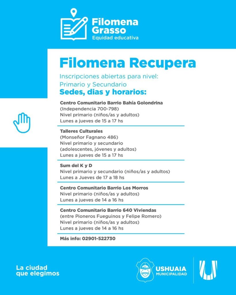 La Secretaría de Cultura y Educación de la Municipalidad de Ushuaia informa a la comunidad que se encuentran abiertas las inscripciones al “Filomena Recupera”, programa de apoyo escolar gratuito para los niveles primario y secundario contando con cupos para todas las edades en ambos casos. Quiénes deseen inscribirse, podrán hacerlo a través del teléfono 2901-522730, así como acceder a más información.