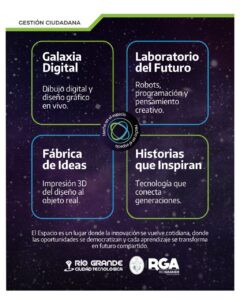 El Municipio de Río Grande, a través de la Secretaría de Gestión Ciudadana, recuerda a las vecinas y vecinos que este sábado 15, a partir de las 15:30 horas, se realizará la muestra interactiva “Hecho en el Espacio” en las instalaciones del Espacio Tecnológico, ubicado en Pellegrini 520.
