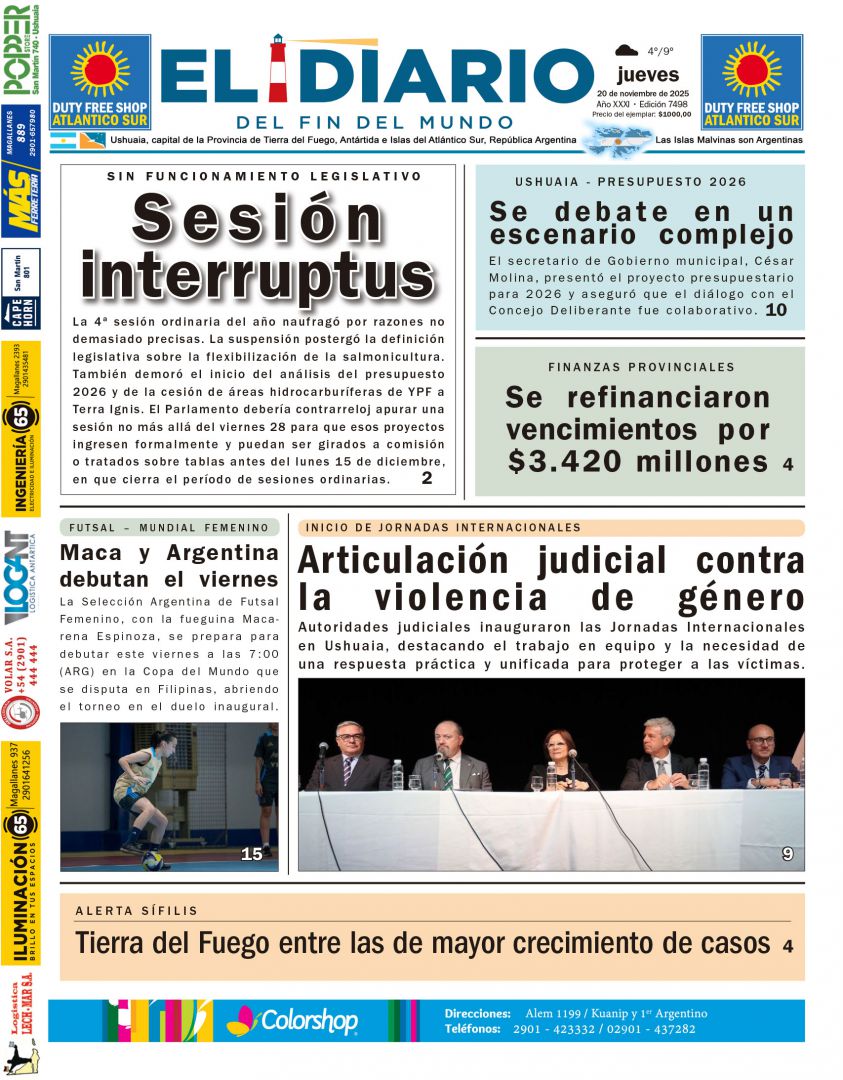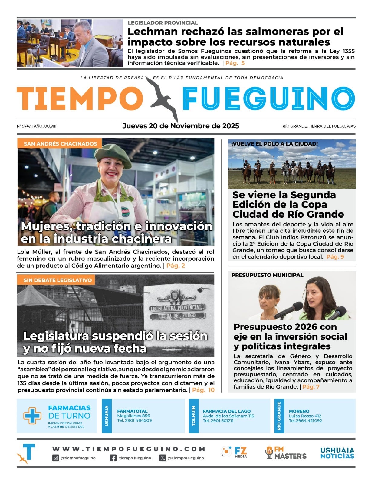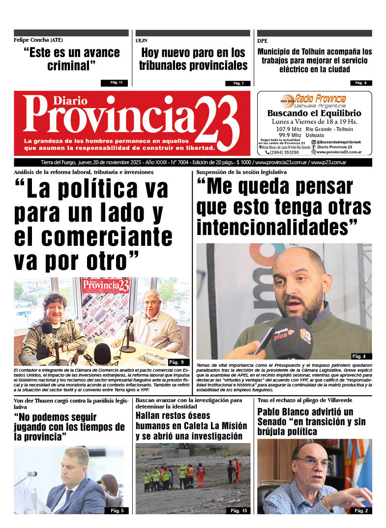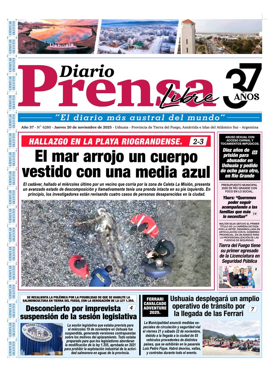 Noticias DIARIOS FUEGUINOS DEL 20/11/2025. noviembre 20, 2025 Continue Reading Previous USHUAIA SE PREPARA PARA RECIBIR LA CAVALCADE: HABRÁ OPERATIVO DE TRÁNSITO Y SEGURIDAD VIAL DEL MUNICIPIO PARA LA EXHIBICIÓN DE FERRARINext DIARIOS NACIONALES DEL 20/11/2025.