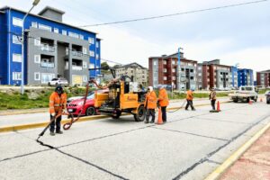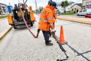 En paralelo, equipos municipales llevaron adelante tareas de sellado de juntas sobre la avenida Hipólito Yrigoyen, en el marco de las acciones permanentes de mantenimiento vial.