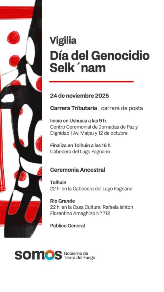 Además, el lunes 24 de noviembre se desarrollarán diversas actividades abiertas a la comunidad. A las 22 h. se llevará adelante una vigilia con ceremonia ancestral en la Casa Cultural Rafaela Ishton de Río Grande y, simultáneamente, en la cabecera del Lago Fagnano en Tolhuin.
