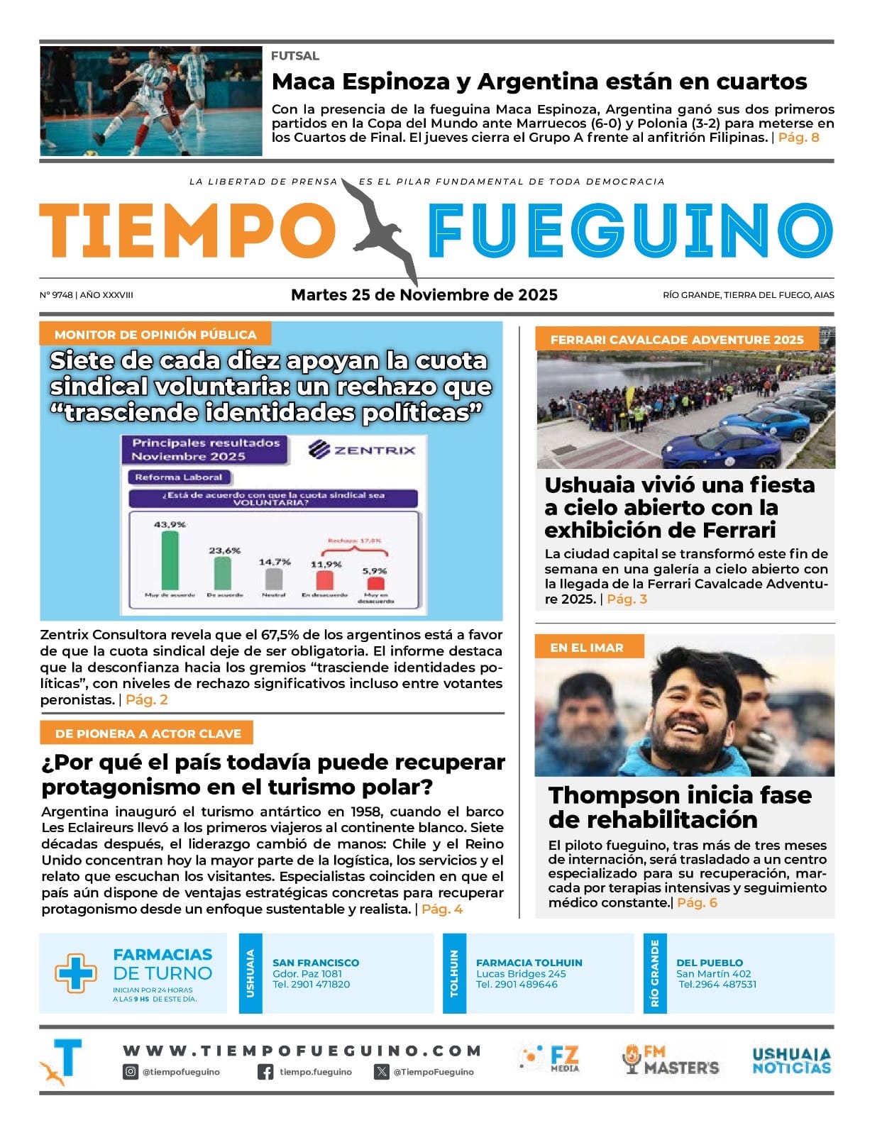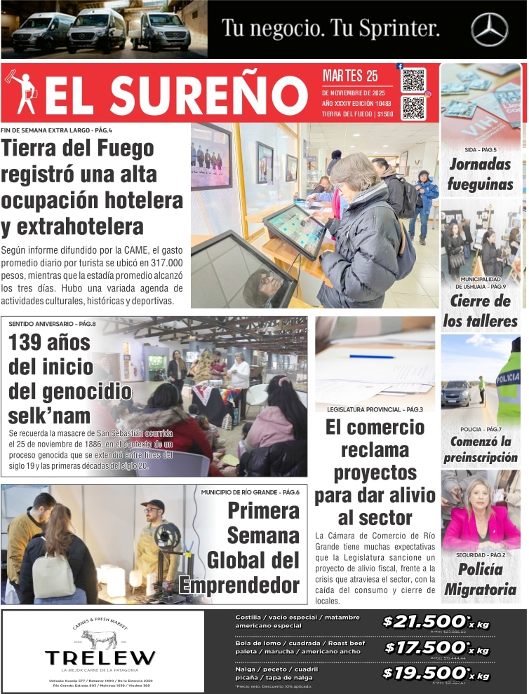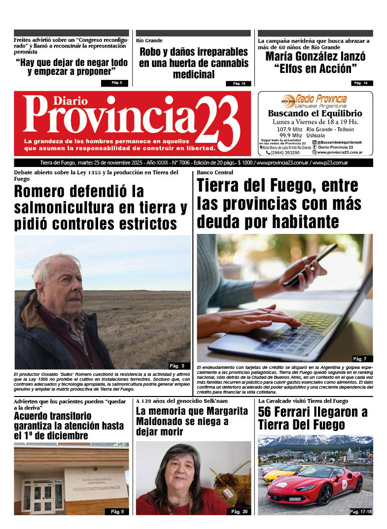 Noticias DIARIOS FUEGUINOS DEL 25/11/2025. noviembre 25, 2025 Continue Reading Previous TIERRA DEL FUEGO DESTACĂ“ SU POTENCIAL AGROALIMENTARIO EN UN ENCUENTRO FEDERAL DE DESARROLLO PRODUCTIVO EN CHILENext DIARIOS NACIONALES DEL 25/11/2025.