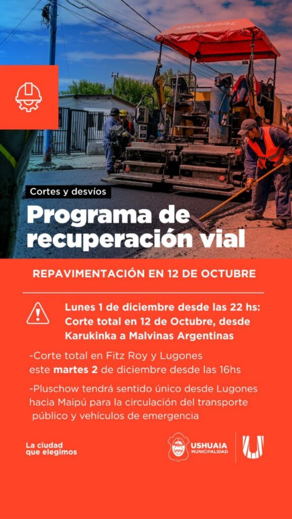 El martes 2 de diciembre, a partir de las 7.30 horas comenzarán los trabajos de fresado en 12 de Octubre, que se desarrollarán en dos tramos: El primero entre Karukinka y Fitz Roy, con una duración aproximada de tres horas, mientras que el segundo tramo será entre Fitz Roy y Avenida Malvinas Argentinas, previsto desde las 11.30 horas en adelante. En tanto, cabe mencionar que se dispondrá el corte de la calle Fitz Roy desde las 16 horas, entre Lugones y 12 de Octubre, para evitar cruces durante las tareas.