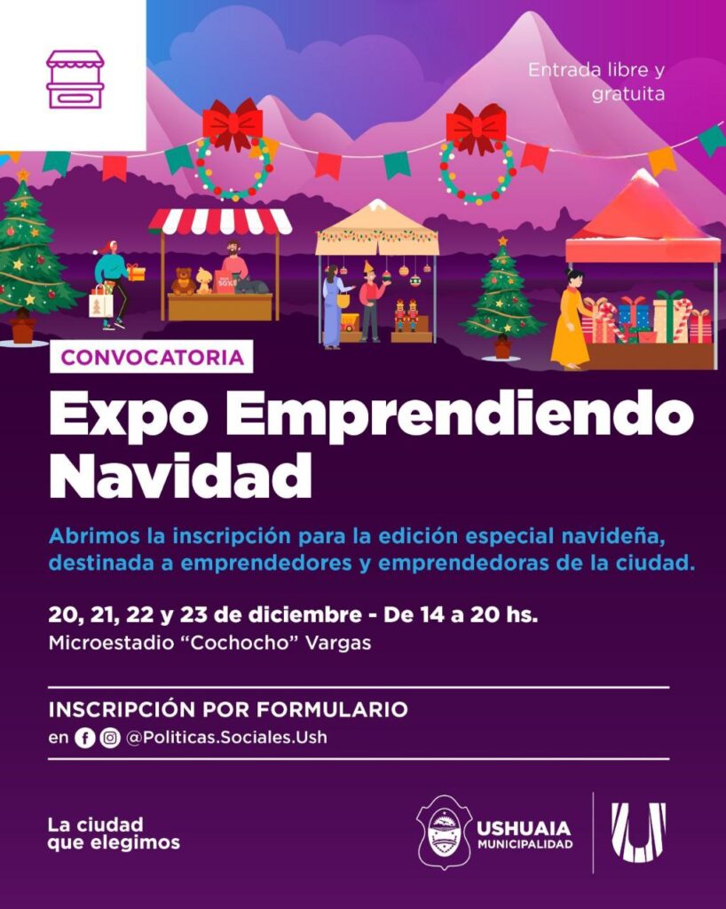 Emprendedores y emprendedoras de Ushuaia ya pueden inscribirse para la Expo Emprendiendo Navidad que se realizará los días 20, 21, 22 y 23 de diciembre en el microestadio municipal “Cochocho” Vargas, organizada por la Municipalidad capitalina a través de la Secretaría de Políticas Sociales, Sanitarias y Derechos Humanos.