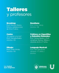 Para conocer más sobre la oferta de Talleres Culturales que la Municipalidad de Ushuaia impulsa, las y los interesados podrán visitar las redes sociales de la Secretaría de políticas Ambientales, Culturales y Educativas en @CulturayEducacionUsh.