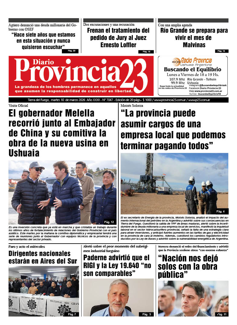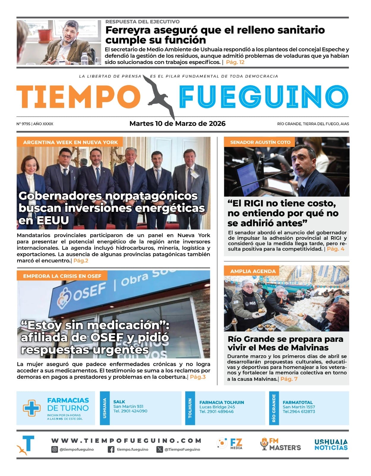 Noticias DIARIOS FUEGUINOS DEL 10/03/2026. marzo 10, 2026 Continue Reading Previous USHUAIA : FERREYRA DESTACÓ LOS TRABAJOS DE MITIGACIÓN EN EL RELLENO SANITARIONext DIARIOS NACIONALES DEL 10/03/2026.