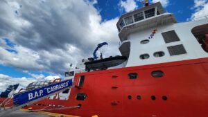 El secretario de Relaciones Parlamentarias y Articulación Política de la Municipalidad de Ushuaia, Omar Becerra, visitó el B.A.P. Carrasco, buque científico de última generación de la Marina de Guerra del Perú que llegó a la capital fueguina en el marco de la Campaña Científica ANTAR-XXXII.