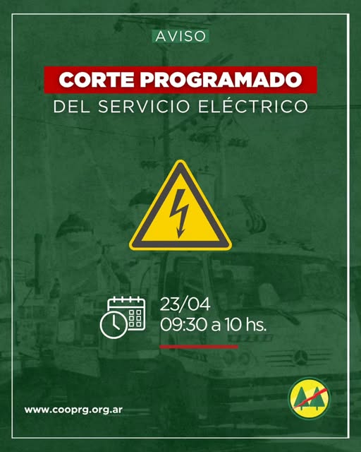 Noticias Cooperativa Eléctrica de Rio Grande : CORTE PROGRAMADO POR TRABAJOS EN LA RED ELÉCTRICA abril 21, 2026 Jueves, 23 de abril HORARIO: De 09:30 a 10hs. ZONAS AFECTADAS: B° Parque Industrial Calles: – Sarmiento (entre Einstein y Juan J. Paso) – 25 de Mayo (entre Juan J. Paso y Ercilla Suárez) Los trabajos se llevarán a cabo siempre y cuando las condiciones meteorológicas sean favorables. Pedimos disculpas por las molestias ocasionadas. #CooperativaEléctrica #RíoGrande #SiempreActiva #TDFAIAS Continue Reading Previous “ESTAMOS TRABAJANDO CON NUESTRO EQUIPO Y CON EL SECTOR PRODUCTIVO PARA EVALUAR EL ALCANCE DEL NUEVO DECRETO”
