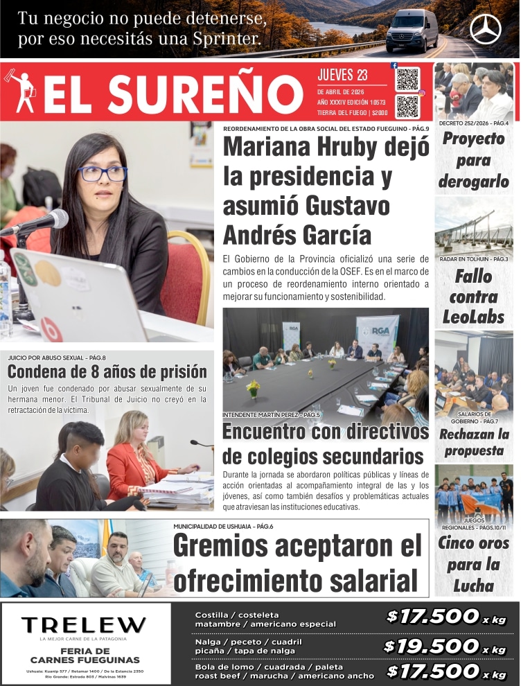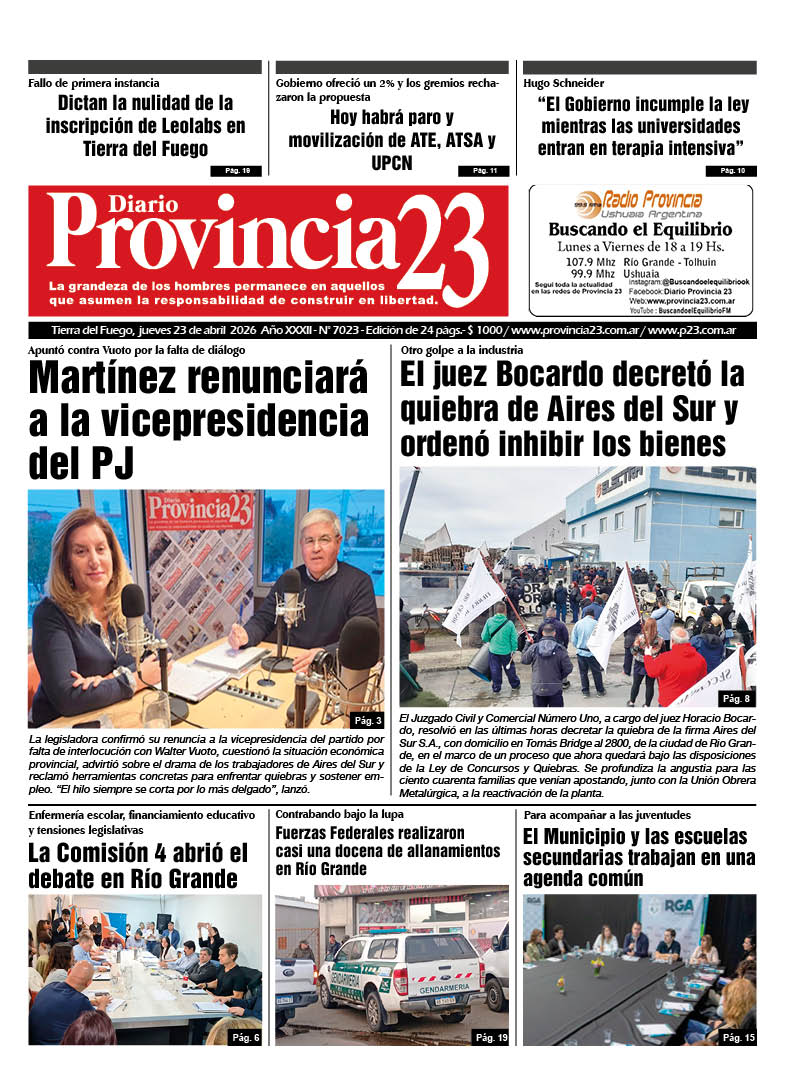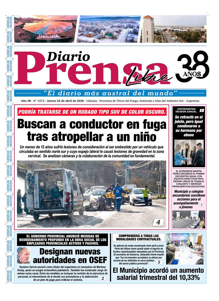 Noticias DIARIOS FUEGUINOS DEL 23/04/2026. abril 23, 2026 Continue Reading Previous EL GOBIERNO PROVINCIAL REFUERZA EL PLAN DE REORDENAMIENTO DE LA OBRA SOCIAL DEL ESTADO FUEGUINO