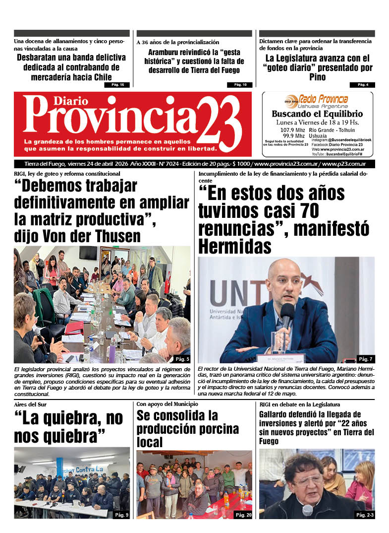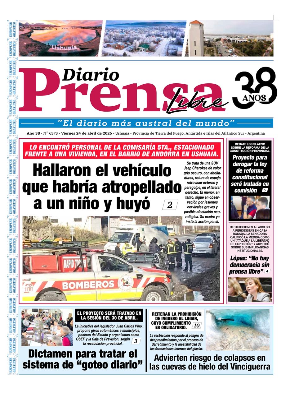 Noticias DIARIOS FUEGUINOS DEL 24/04/2026. abril 24, 2026 Continue Reading Previous USHUAIA : LA MUNICIPALIDAD HABILITÓ EL PAGO DE LA OBRA DE PAVIMENTACIÓN DE CALLE DE LOS ÑIRES
