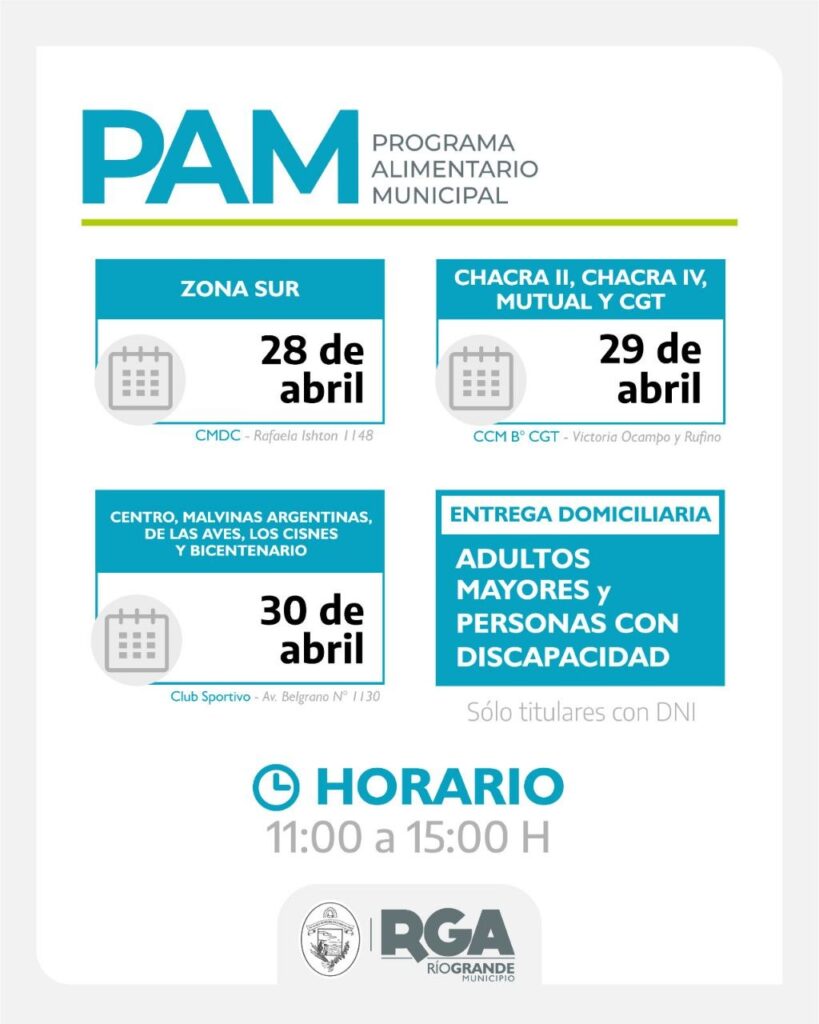 El Municipio de Río Grande recuerda a los vecinos y vecinas que este martes 28 de abril comienza la distribución de los módulos alimentarios en diferentes puntos de la ciudad, destinada a quienes están empadronados en el Programa Alimentario Municipal.