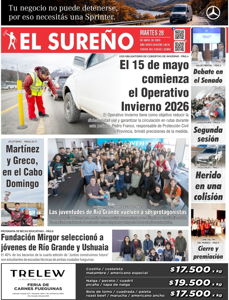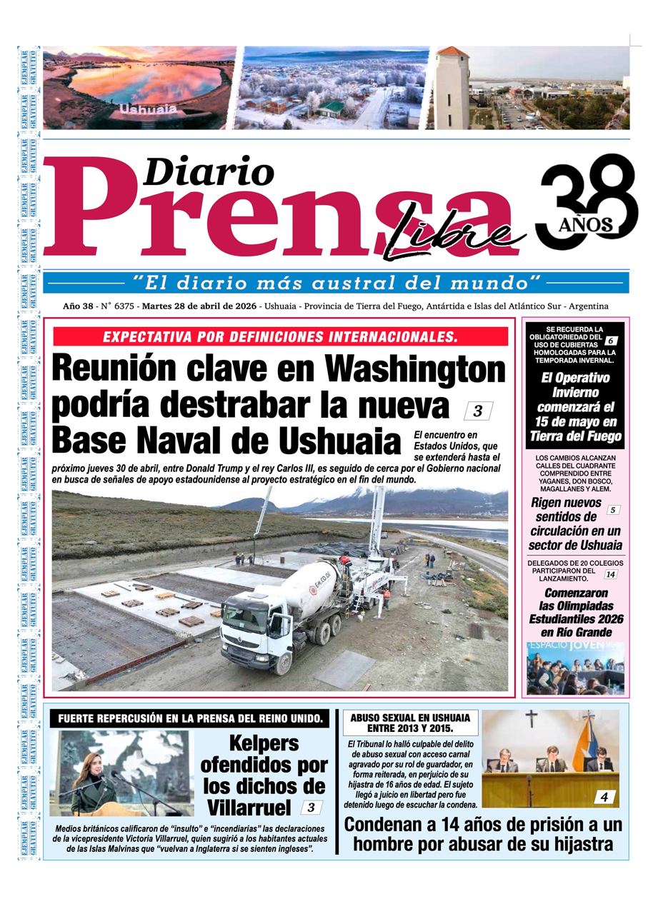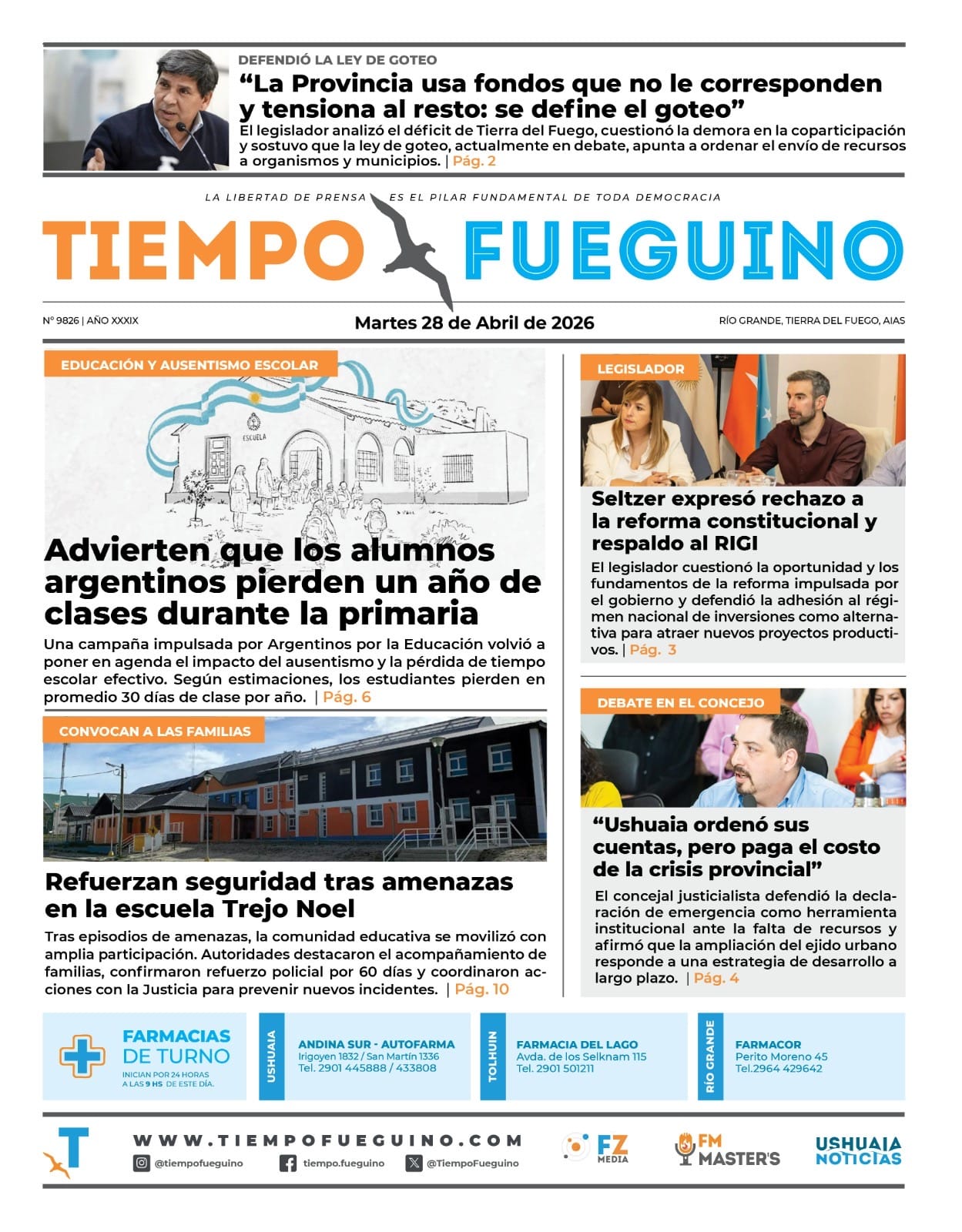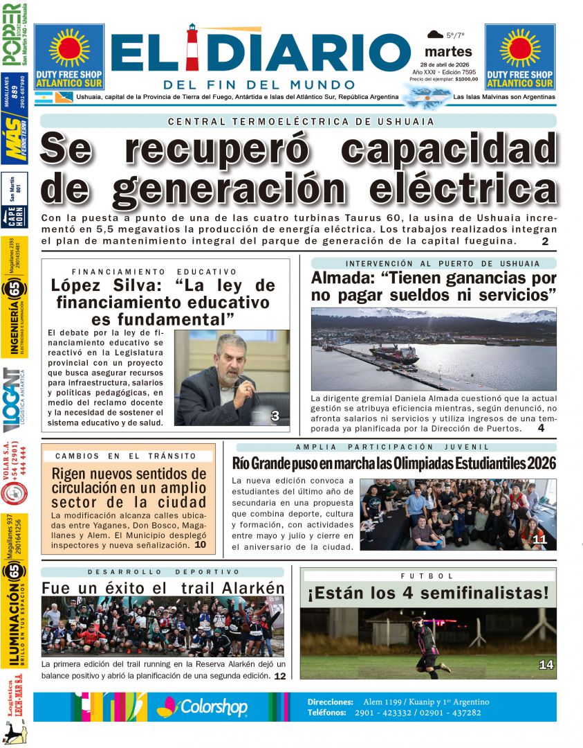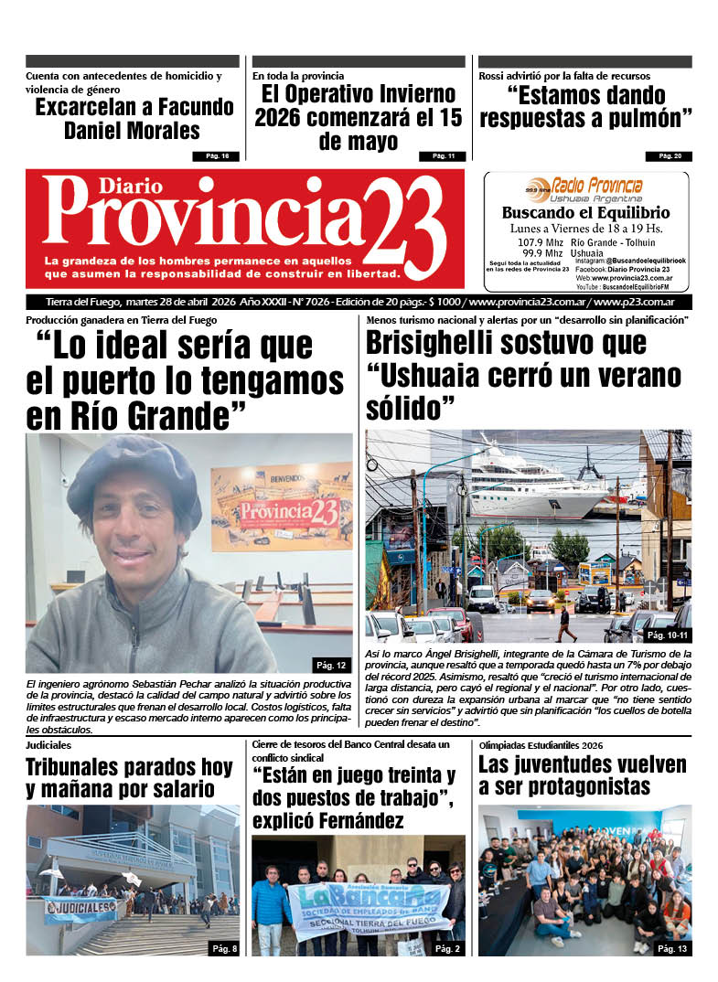 Noticias DIARIOS FUEGUINOS DEL 28/04/2026. abril 28, 2026 Continue Reading Previous USHUAIA : LA MUNICIPALIDAD LLEVĂ“ ADELANTE UNA JORNADA COMUNITARIA EN EL BARRIO LA CANTERANext DIARIOS NACIONALES DEL 28/04/2026.