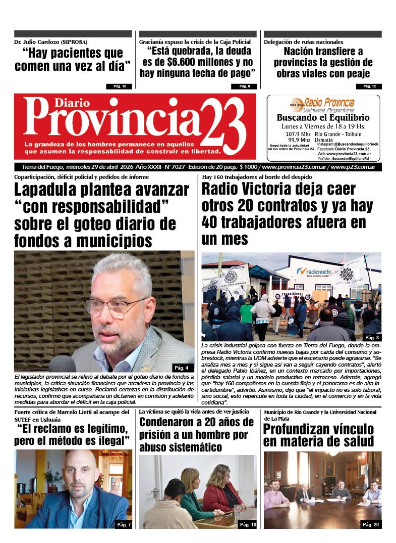 Noticias DIARIOS FUEGUINOS DEL 29/04/2026. abril 29, 2026 Continue Reading Previous EN TOLHUIN, LA POLICÍA PROVINCIAL MANTIENE REUNIONES CON VECINOS PARA REFORZAR TAREAS DE PREVENCIÓN DEL DELITONext DIARIOS NACIONALES DEL 29/04/2026.