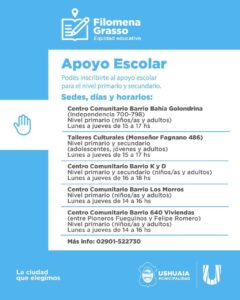 USHUAIA : ABREN LAS INSCRIPCIONES AL PROGRAMA DE APOYO ESCOLAR “FILOMENA GRASSO”